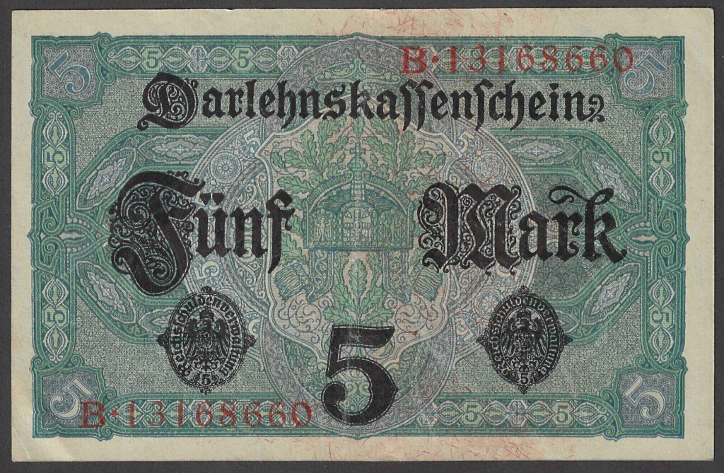 A nota é impressa em azul/cinza, mostrando o rosto de uma jovem com ornamentos florais e de folhagens nos cabelos (talvez uma coroa de flores), o valor numérico da nota e outros elementos de design. Sobreimpressos em preto estão o título/finalidade da nota (Darlehnskassenschein), um brasão, a avaliação textual da nota (Marca Fünf), a data, a autoridade emissora e as assinaturas.