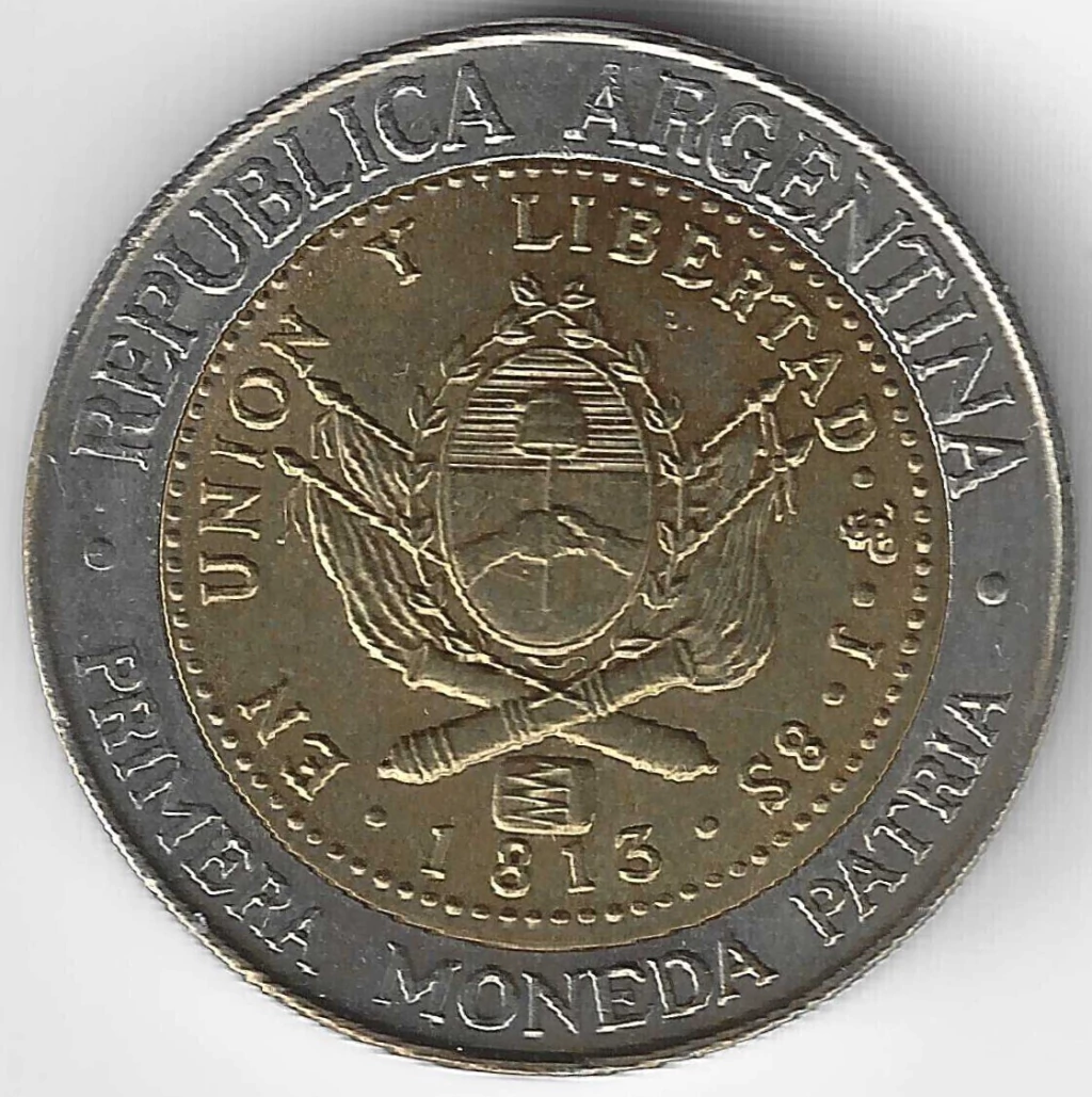 Réplica do reverso da primeira moeda nacional, com o Sol Nacional de 32 raios rodeado pela inscrição