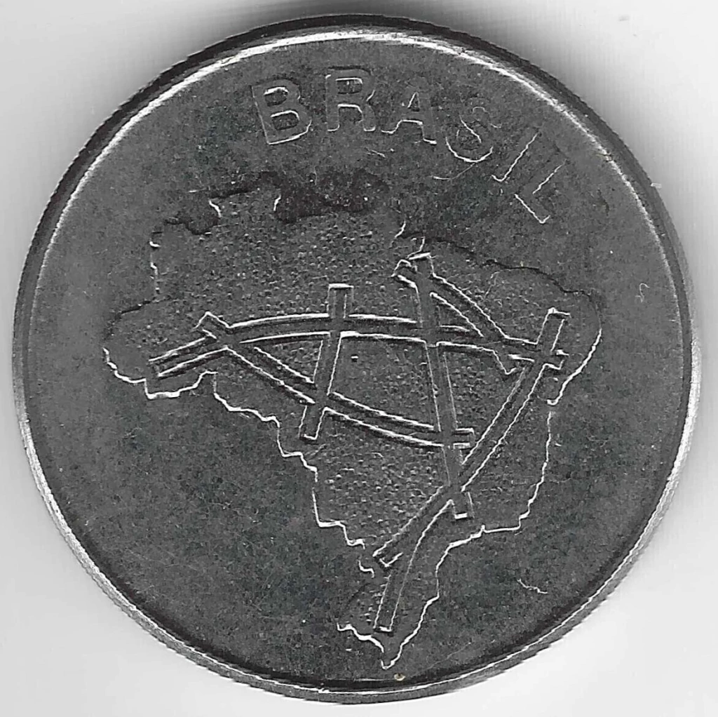 Denominação facial da peça representada por "10 Cruzeiros", data de cunhagem logo abaixo, sem segundo plano temos a divisão da gravura marcada por linhas onduladas.