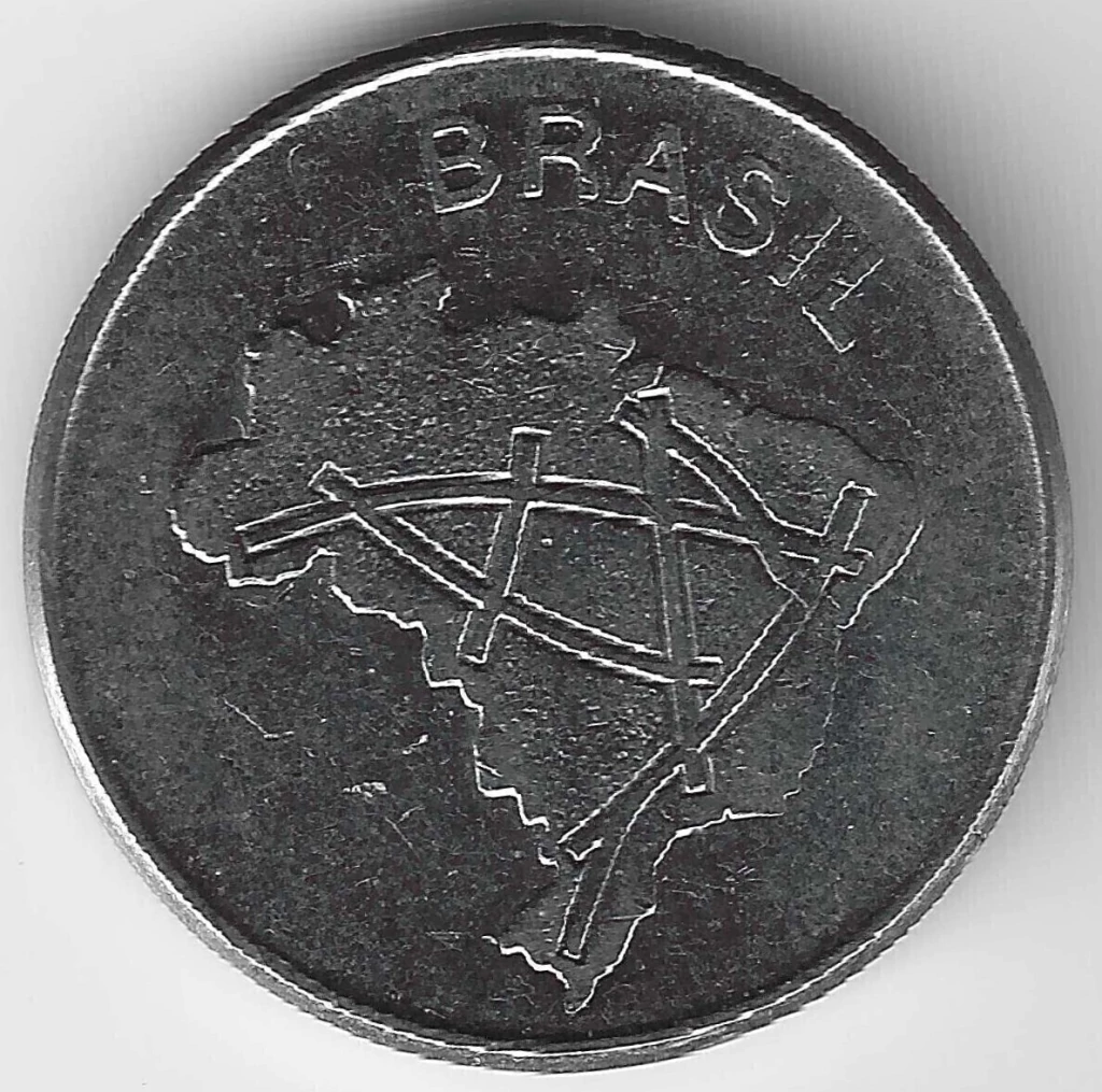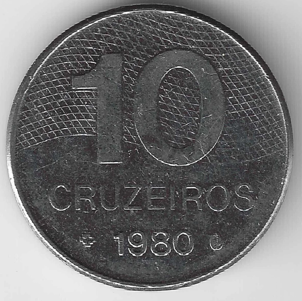 Denominação facial da peça representada por "10 Cruzeiros", data de cunhagem logo abaixo, sem segundo plano temos a divisão da gravura marcada por linhas onduladas.
