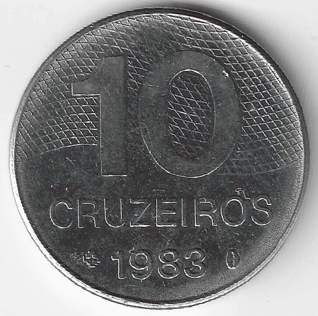 Denominação facial da peça representada por "10 Cruzeiros", data de cunhagem logo abaixo, sem segundo plano temos a divisão da gravura marcada por linhas onduladas.