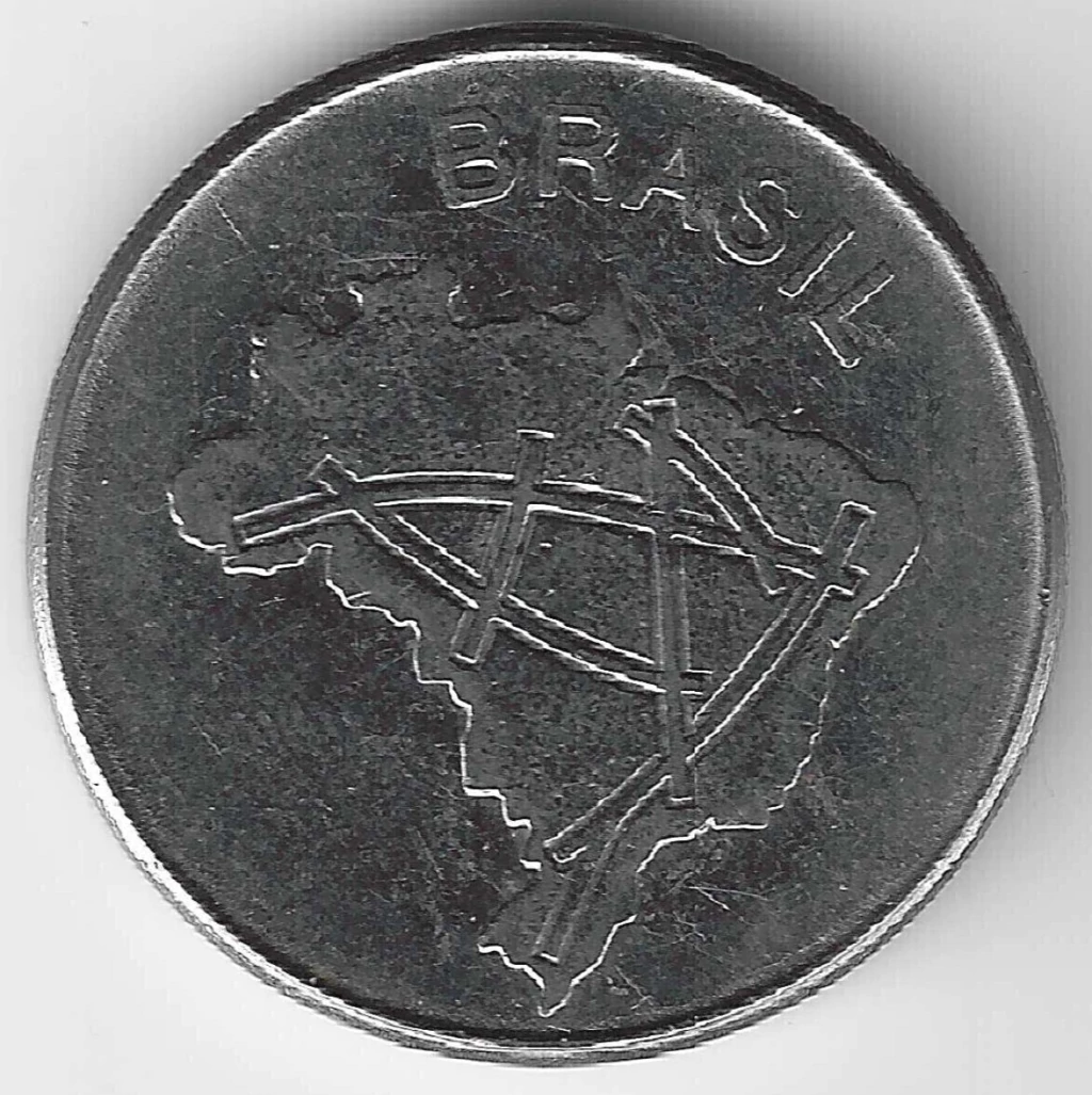 Denominação facial da peça representada por "10 Cruzeiros", data de cunhagem logo abaixo, sem segundo plano temos a divisão da gravura marcada por linhas onduladas.