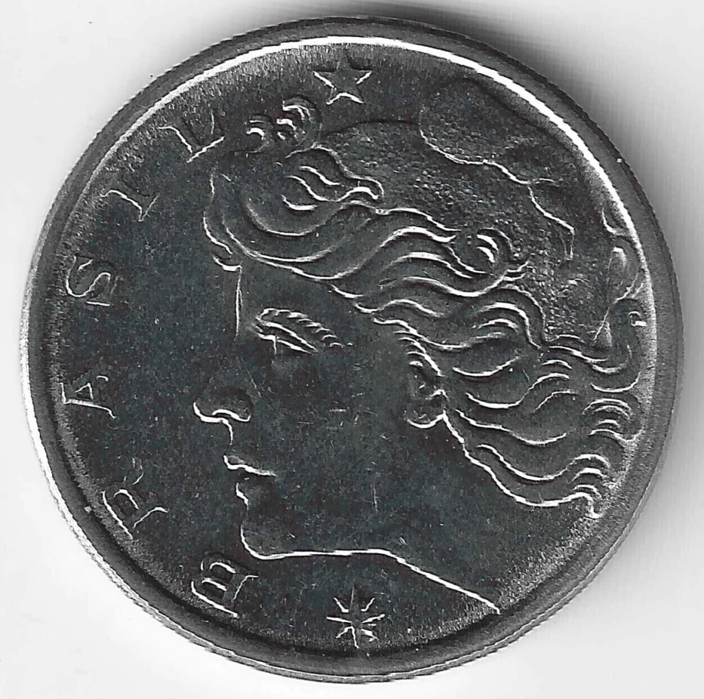 Efígie da república voltada à esquerda, no campo esquerdo a legenda brasil;