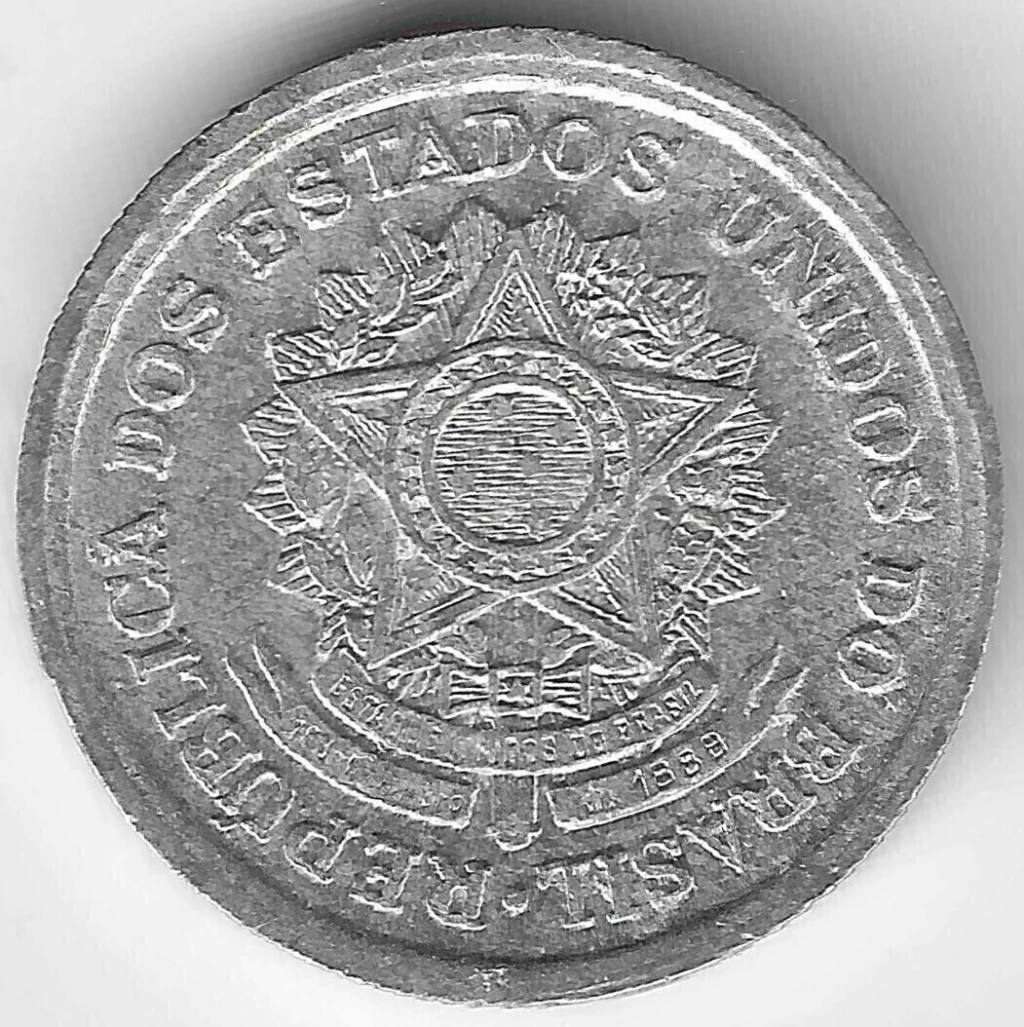 Emblema do Estado do Brasil (uma estrela com um círculo dentro, cercada por 27 pequenas estrelas. Cruzeiro do sul dentro de um círculo ladeado por plantas de tabaco e café);