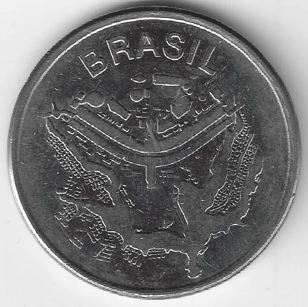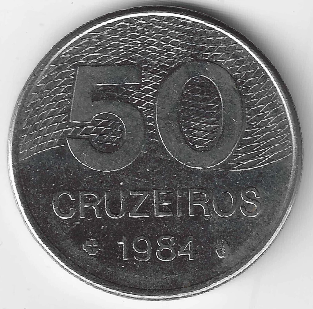 Denominação facial da peça representada por "50 Cruzeiros", data de cunhagem logo abaixo, sem segundo plano temos a divisão da gravura marcada por linhas onduladas.