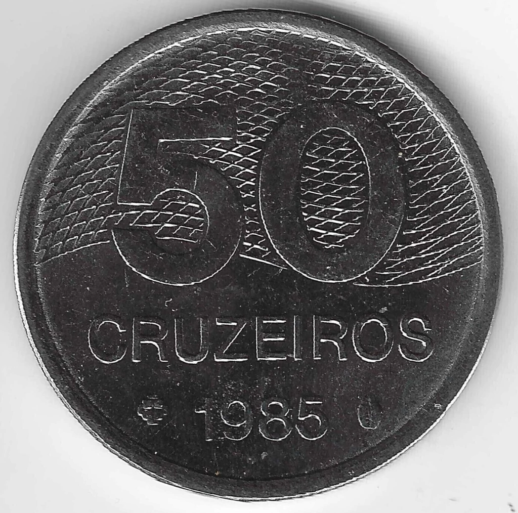 Denominação facial da peça representada por "50 Cruzeiros", data de cunhagem logo abaixo, sem segundo plano temos a divisão da gravura marcada por linhas onduladas.