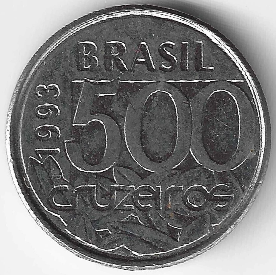 Valor de face em "500" ao centro da gravura, abaixo a denominação monetária em Cruzeiros sob folhasa, data de cunhagem no campo esquerdo e legenda do emissor no acima.