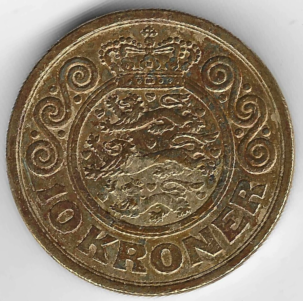 Brasão coroado da Dinamarca ao centro da gravura, com três leões ao centro e tudo dentro de círculo, na orla o valor facial da peça ladeado a ornamentações