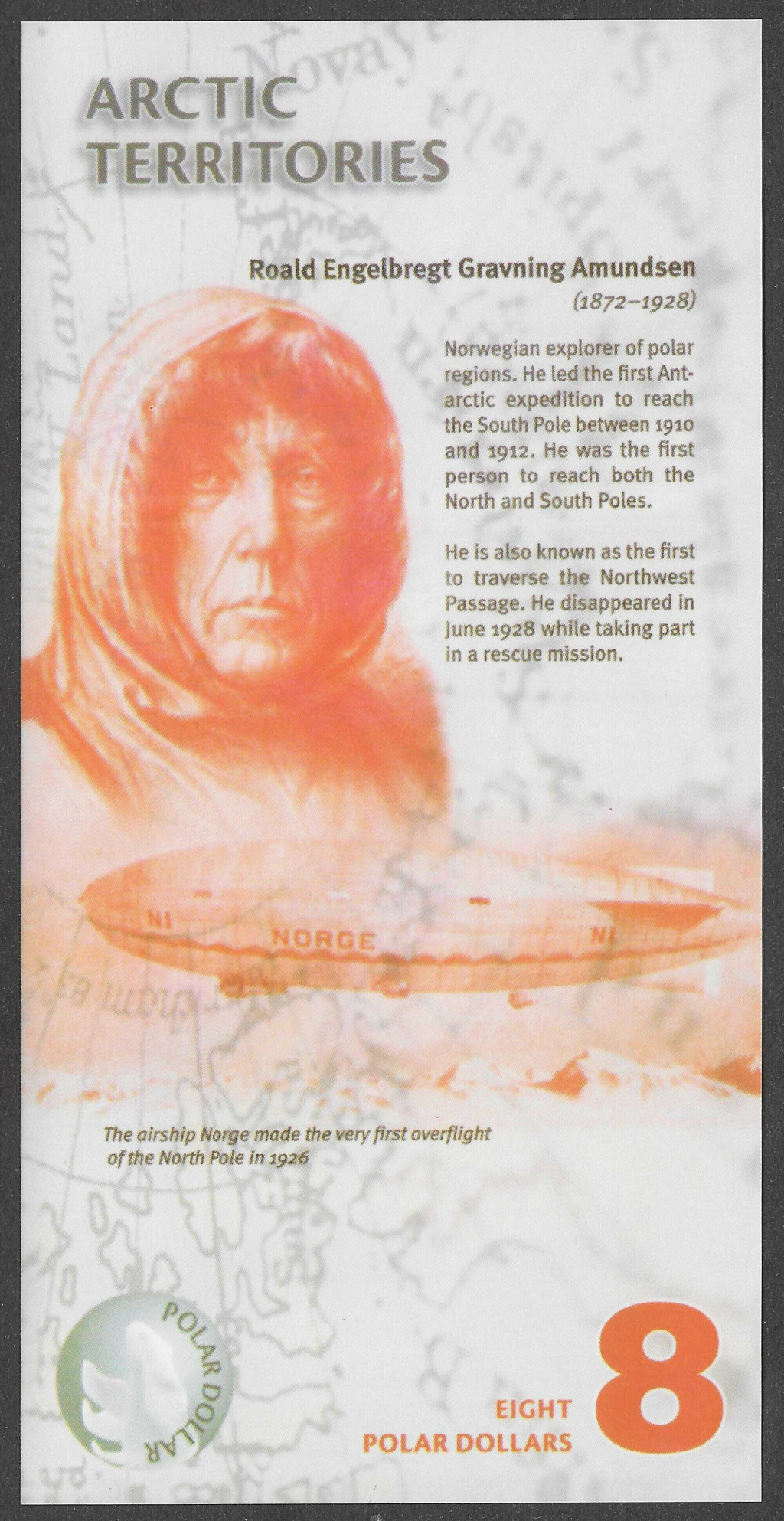 Retrato de Roald Engelbregt Gravning Amundsen com um texto ao lado que fala sobre o explorador norueguês das regiões polares. Liderou a primeira expedição à Antártida a alcançar o Polo Sul entre 1910 e 1912. Foi o primeiro a alcançar os Polos Norte e Sul. Também é conhecido como o primeiro a atravessar a Passagem Noroeste. Desapareceu em junho de 1928 enquanto participava de uma missão de resgate. O dirigível Norge realizou o primeiro sobrevoo do Polo Norte em 1926.